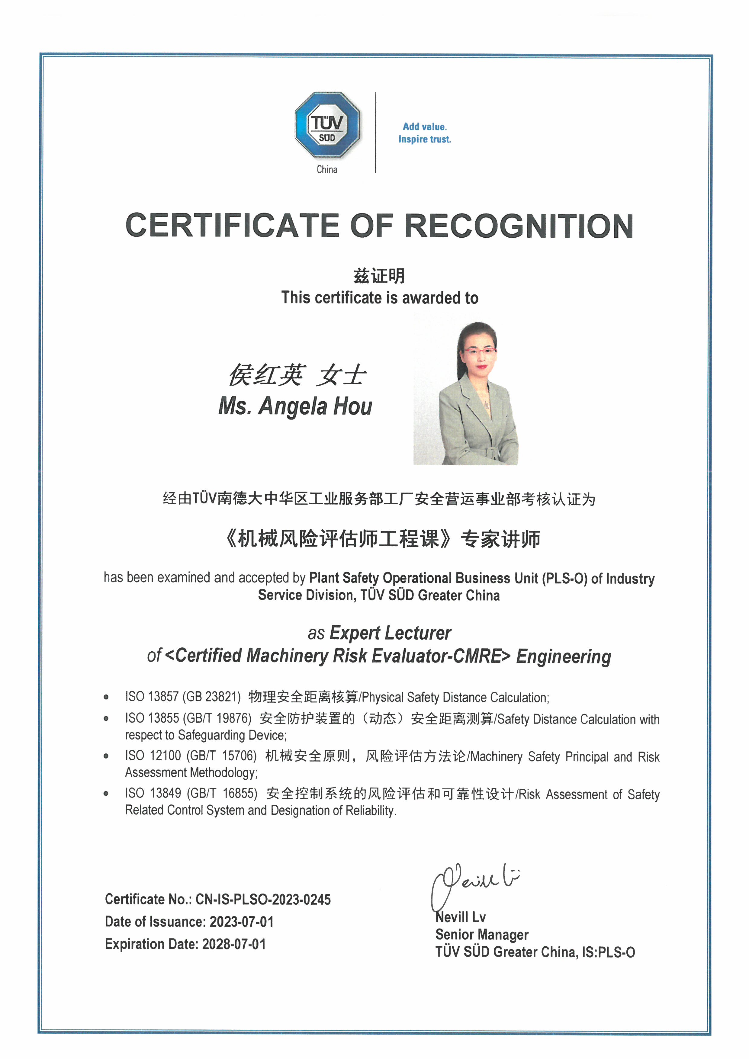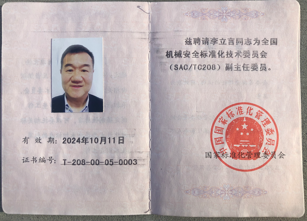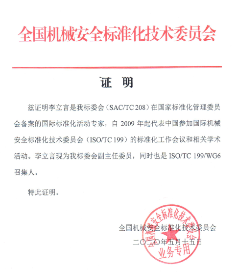 ISO國(guó)際標(biāo)準(zhǔn) (機(jī)械安全)TC199/WG-6 Convenor 分組召集人;ISO國(guó)際標(biāo)準(zhǔn) (機(jī)器人)TC299/WG-3 工業(yè)機(jī)器人安全標(biāo)準(zhǔn)專家。