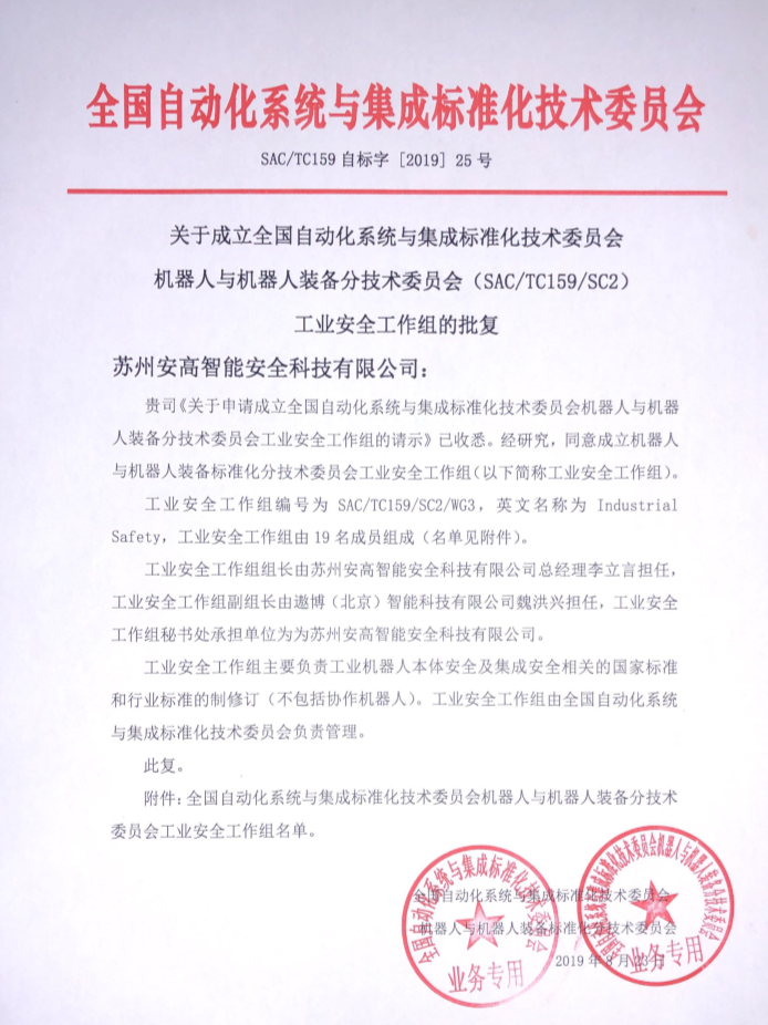 立宏安高一直致力于工業(yè)安全標(biāo)準(zhǔn)的工作,直接對(duì)口國際標(biāo)準(zhǔn)ISO/TC 299-WG3機(jī)器積人安全工作組,積極投入到國家標(biāo)準(zhǔn)GB,國際標(biāo)準(zhǔn)ISO的各項(xiàng)安全工作標(biāo)準(zhǔn)中,2019年經(jīng)國標(biāo)委下屬全國自動(dòng)化系統(tǒng)與集成標(biāo)準(zhǔn)化技術(shù)委員會(huì) 機(jī)器人與機(jī)器人裝備分技術(shù)委員會(huì)的研究,同意成立機(jī)器人與機(jī)器人裝備標(biāo)準(zhǔn)化分技術(shù)委員會(huì)工業(yè)安全工作組(簡稱工業(yè)安全工作組)是國內(nèi)唯一一家C類行業(yè)機(jī)器人的安全獨(dú)立工作組,本工作組直接對(duì)口國際ISO/TC 299-WG3機(jī)器人工作組。